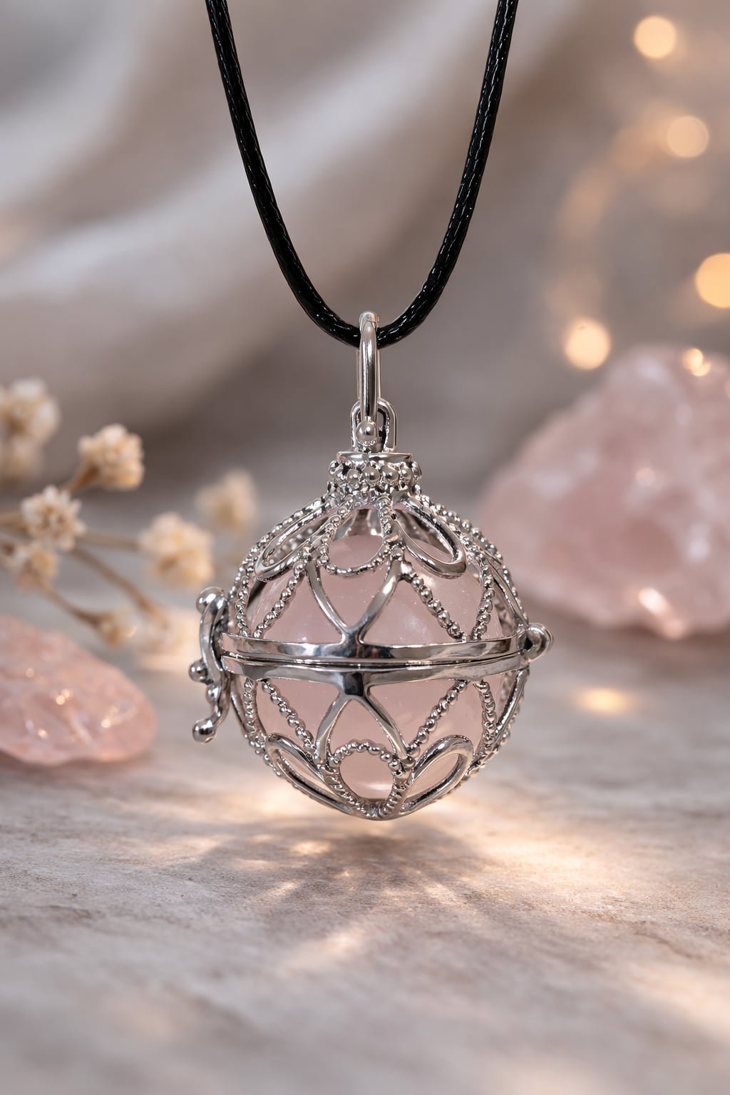 this Rose Quartz pendant carries the energy of unconditional love and emotional healing. The gentle pink crystal glows from within its protective cage, symbolising a heart that is both open and protected. Designed to rest close to your heart, this piece invites softness, compassion, and calm into your everyday life. It is a reminder that true strength lives in gentleness. Wear it as your daily ritual of self-love, emotional balance, and quiet confidence.