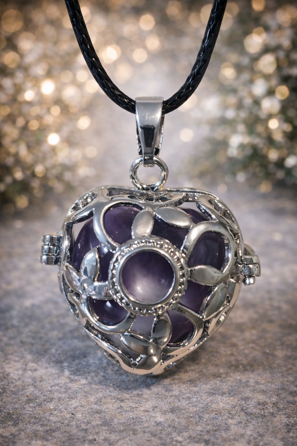 Encased in an intricate silver heart, this luminous Amethyst stone radiates calm, clarity, and spiritual grace. Designed to awaken intuition and soothe the soul, it carries a gentle yet powerful energy that supports inner peace and emotional balance. Wear it as a symbol of self-love, protection, and higher connection.